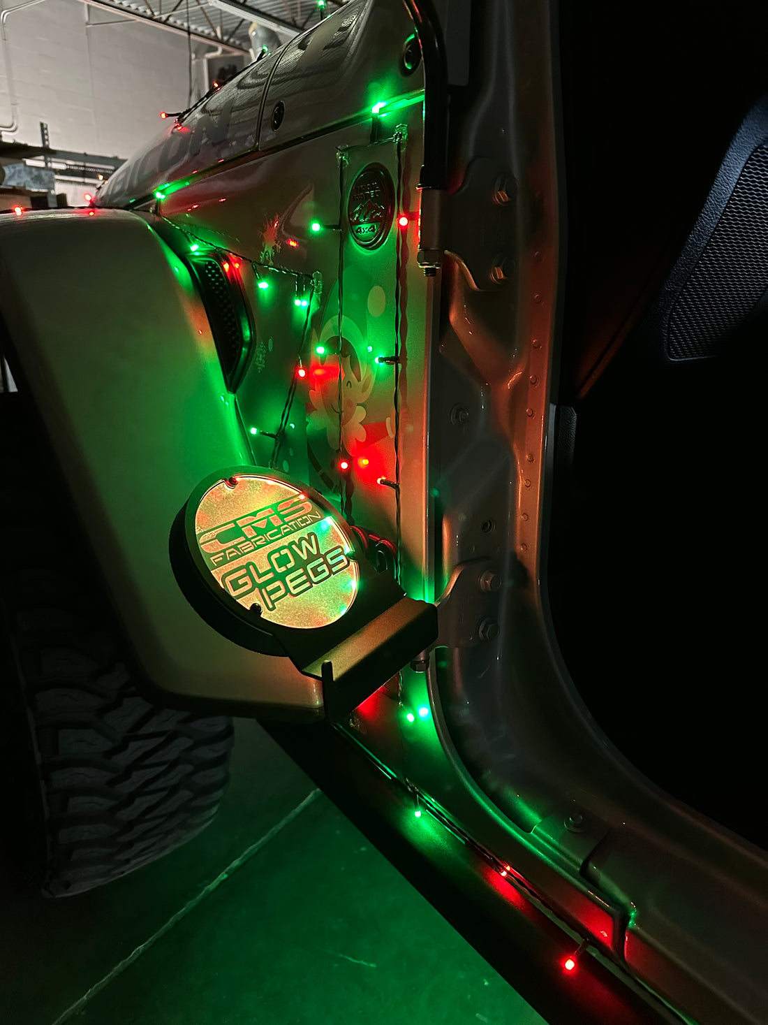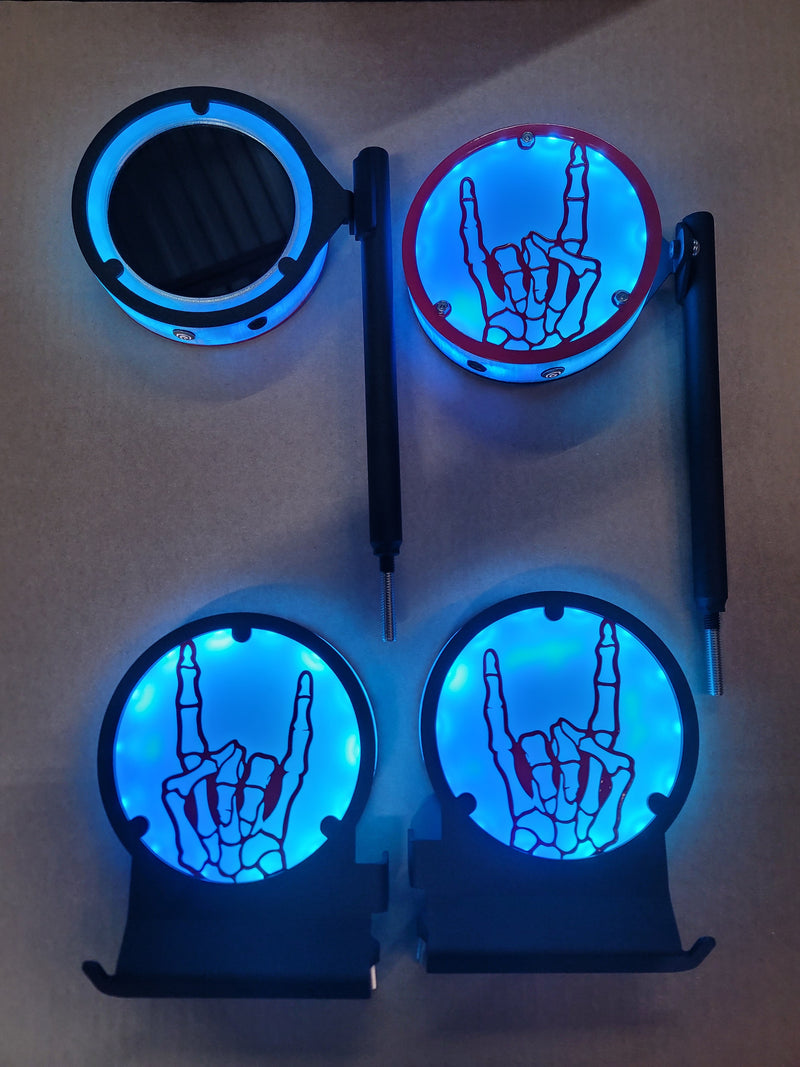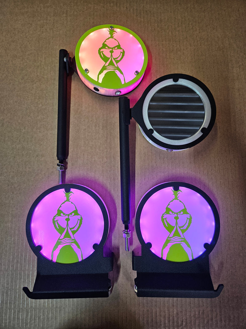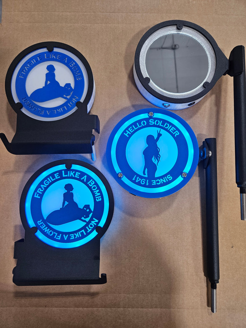 Here are just a few examples of the different custom Glow Peg & Mirror designs we’ve created. If you can imagine it, we can build it — from logos and symbols to fully personalized Jeep lighting setups that match your Glow Mirrors and Inner Fenders.