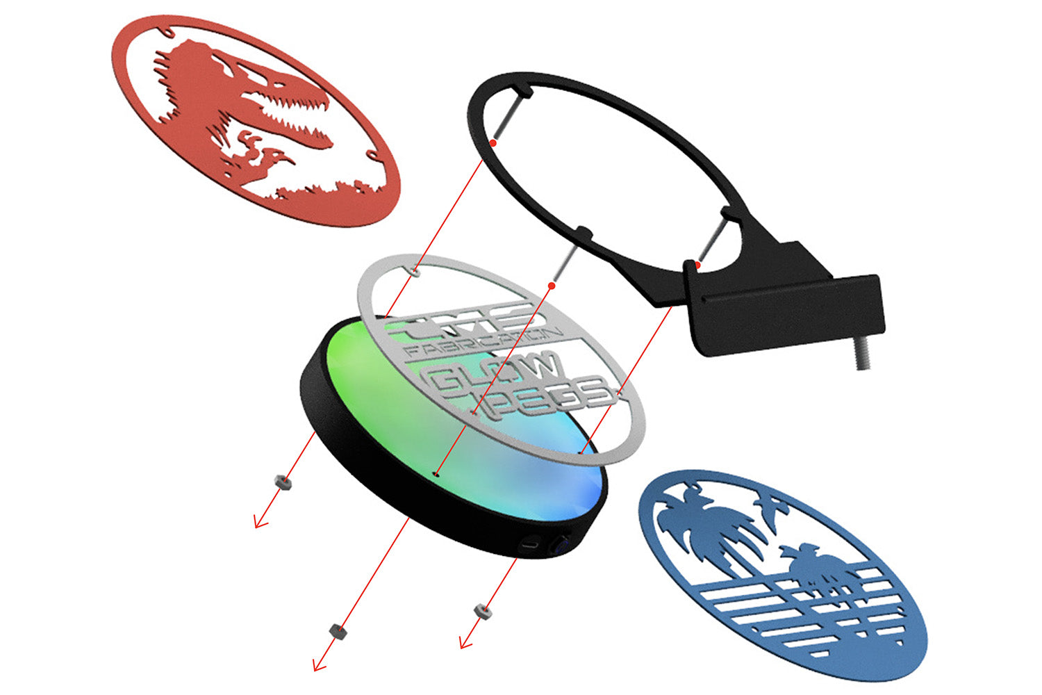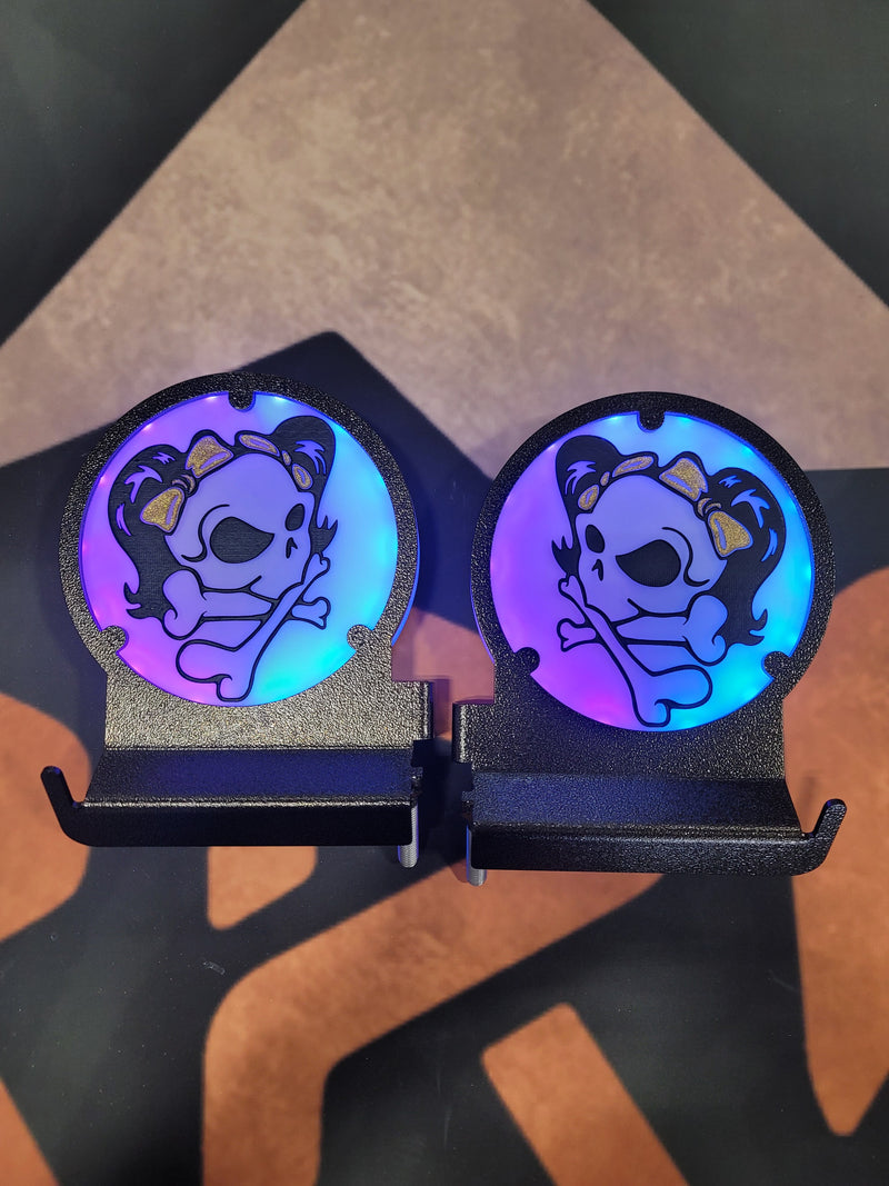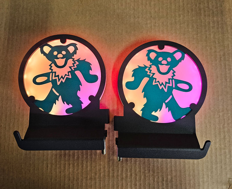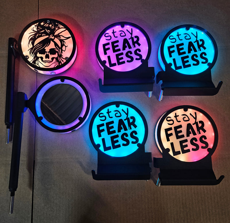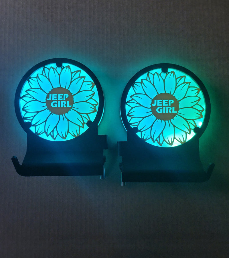 Here are just a few examples of the different custom Glow Peg & Mirror designs we’ve created. If you can imagine it, we can build it — from logos and symbols to fully personalized Jeep lighting setups that match your Glow Mirrors and Inner Fenders.