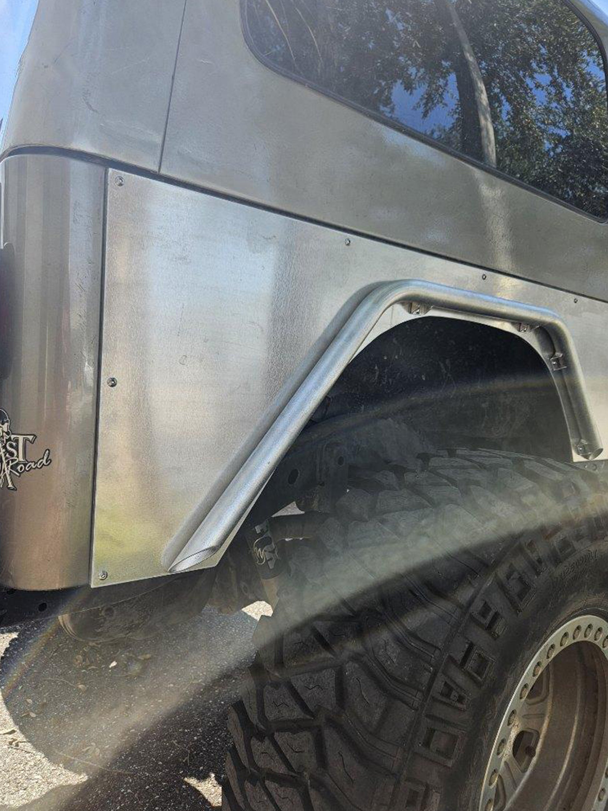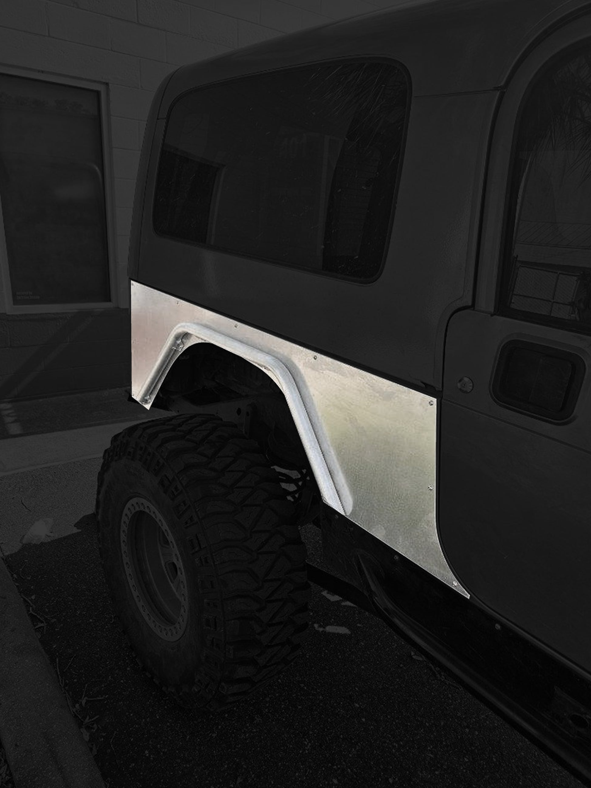 Our Rear Quarter Armor is built from rigid 6061 T-6, 1/8" Aluminum. It's built to accommodate our variety of bolt on tube fender flares (more designs coming soon)